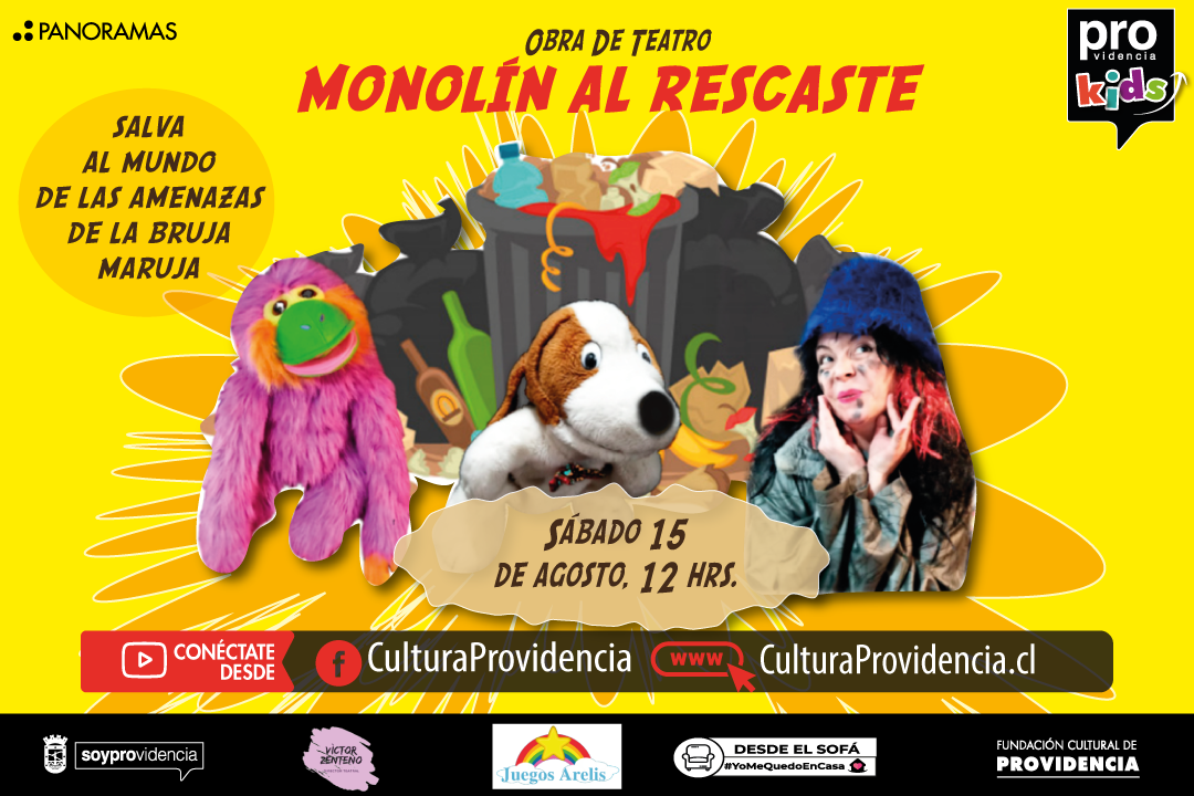 Este sábado 15 de agosto, seguiremos celebrando el mes de los niños con esta entretenida obra de teatro "Monolín al rescate. Salva al mundo de las amenazas de la bruja Maruja".